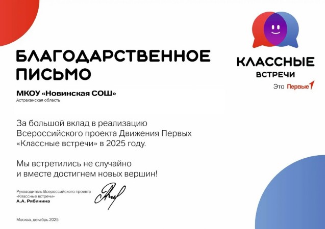 19 декабря 2025 года учащиеся-активисты первичного отделения «Движение Первых» МКОУ «Новинская СОШ» побывали на мастер-классе «Юный корреспондент», организованном региональным отделением Союза журналистов России в в рамках грантового конкурса компании «ЛУКОЙЛ» и «Движеним Первых». Мастер-класс, проведенный журналистами «Астрахань-24», проходил в «Точке кипения» Астраханского государственного университета. Ребята получили уникальную возможность погрузиться в мир телевидения. Помимо функций корреспондента, были глубоко изучены нюансы работы телеведущего, оператора, монтажера и других ключевых специалистов, чье участие критически важно для успешного эфира. Учащиеся смогли представить себе структуру рабочего дня на телеканале, процесс создания телевизионных сюжетов и осознать значение командной работы.
